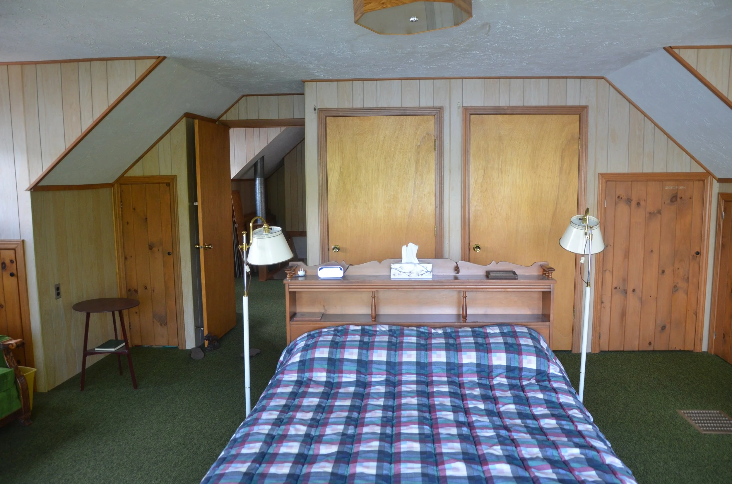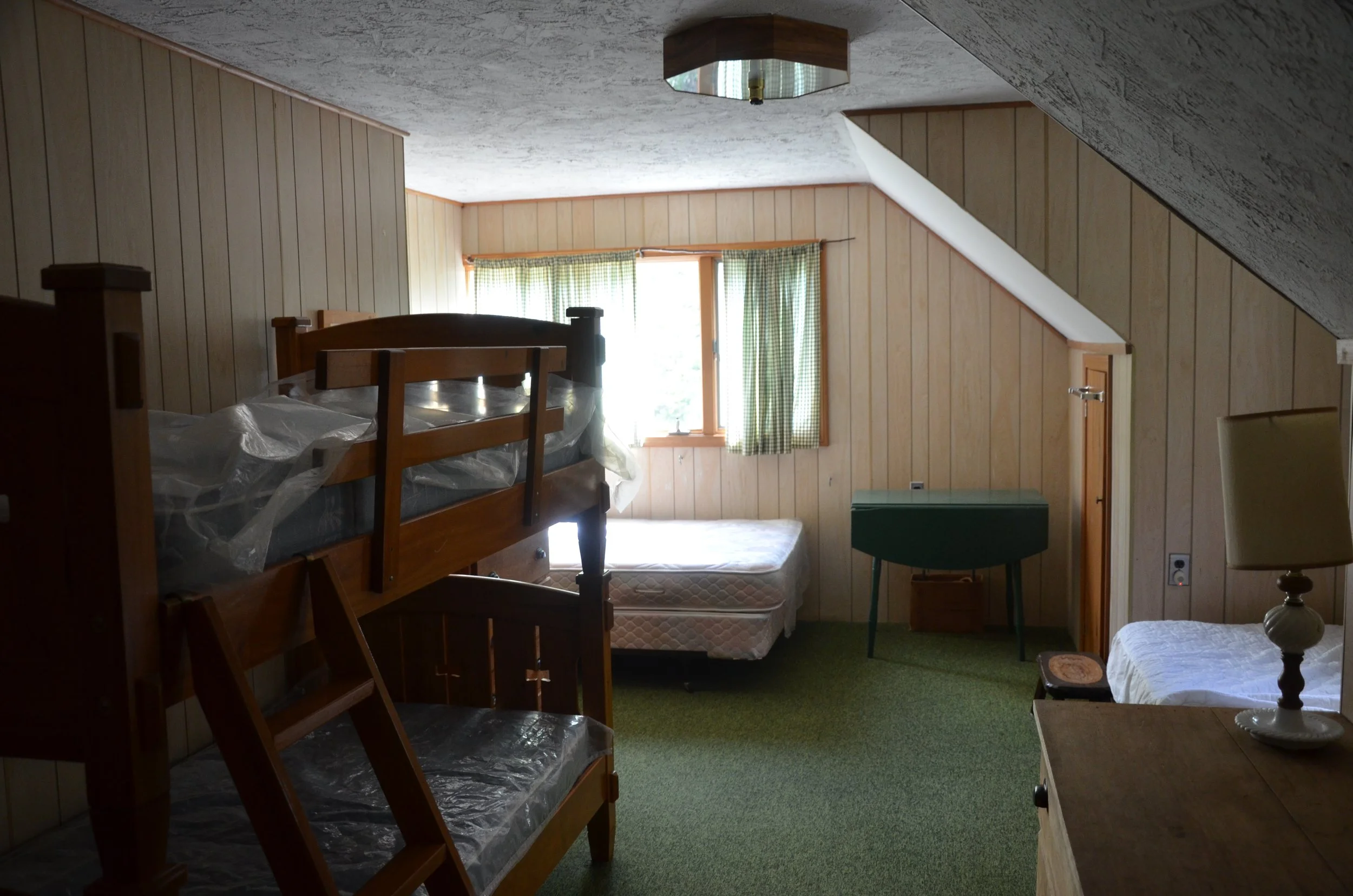 Second floor "Bunk Room". One full, one single with pullout lower single, and a bunk with two singles.